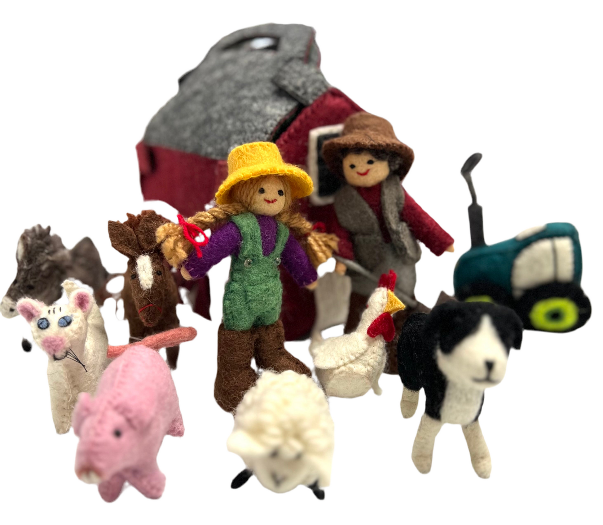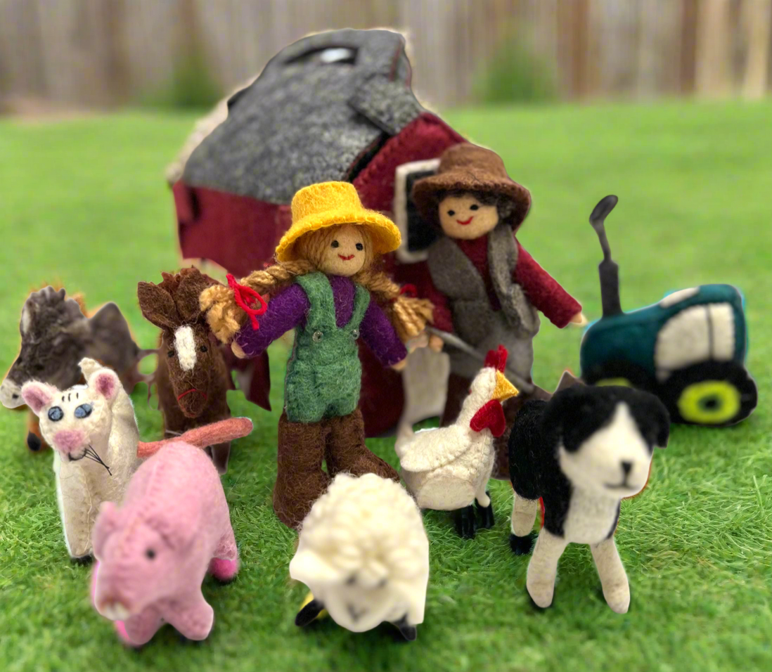 • 12 pieces includes: barnyard, farmer and his wife, tractor, pig, sheep, cow, chook, cat, horse, donkey, dog