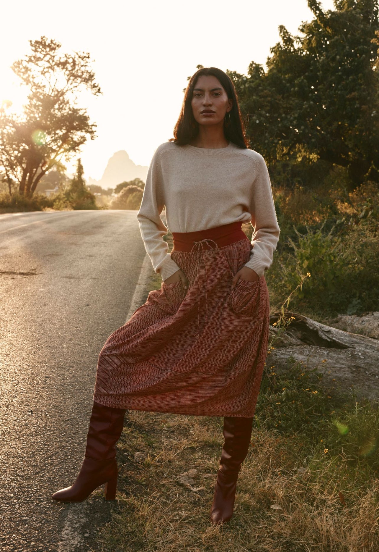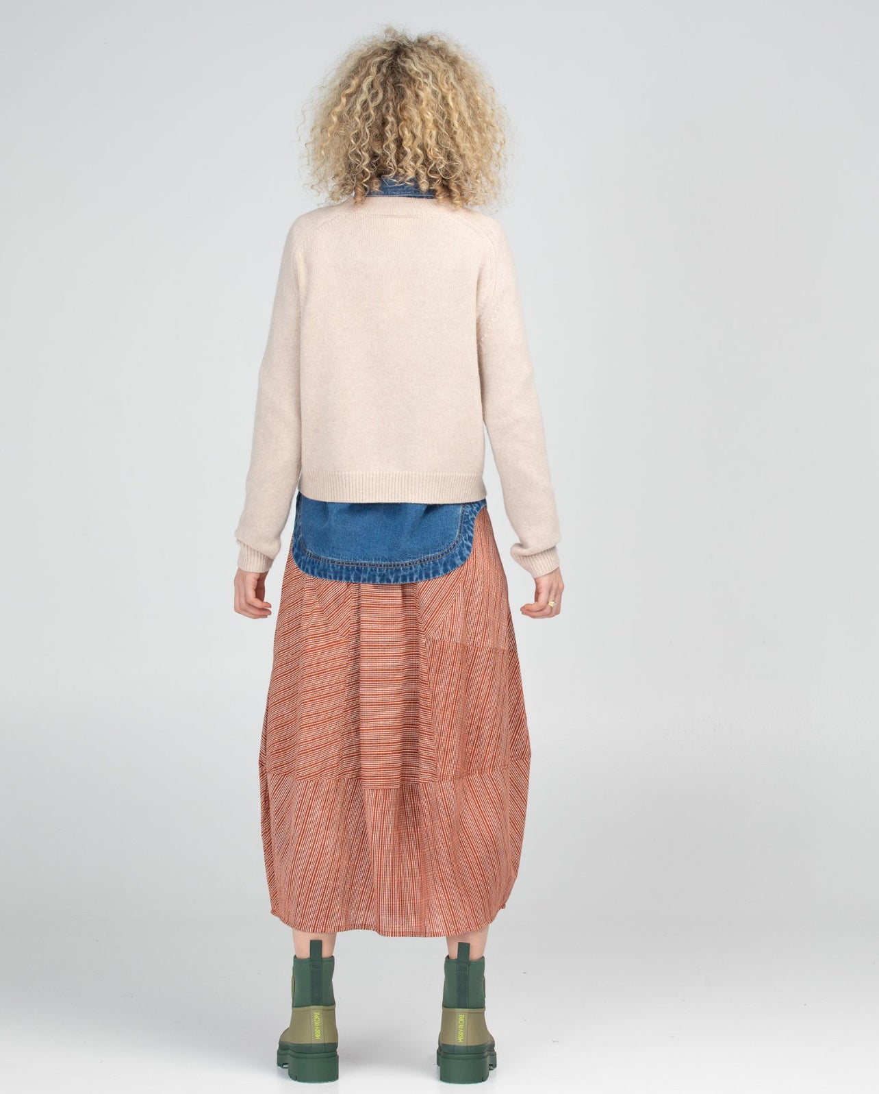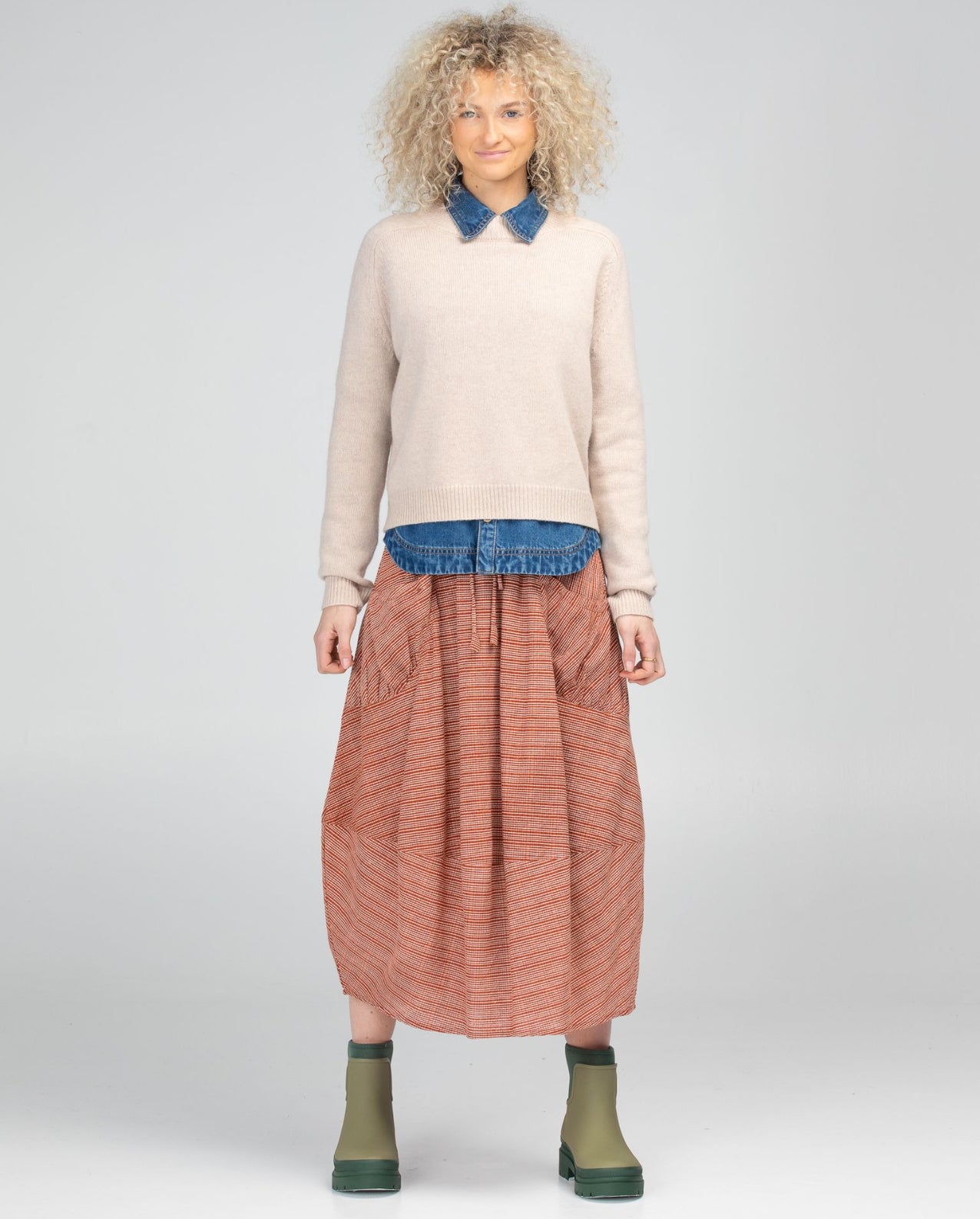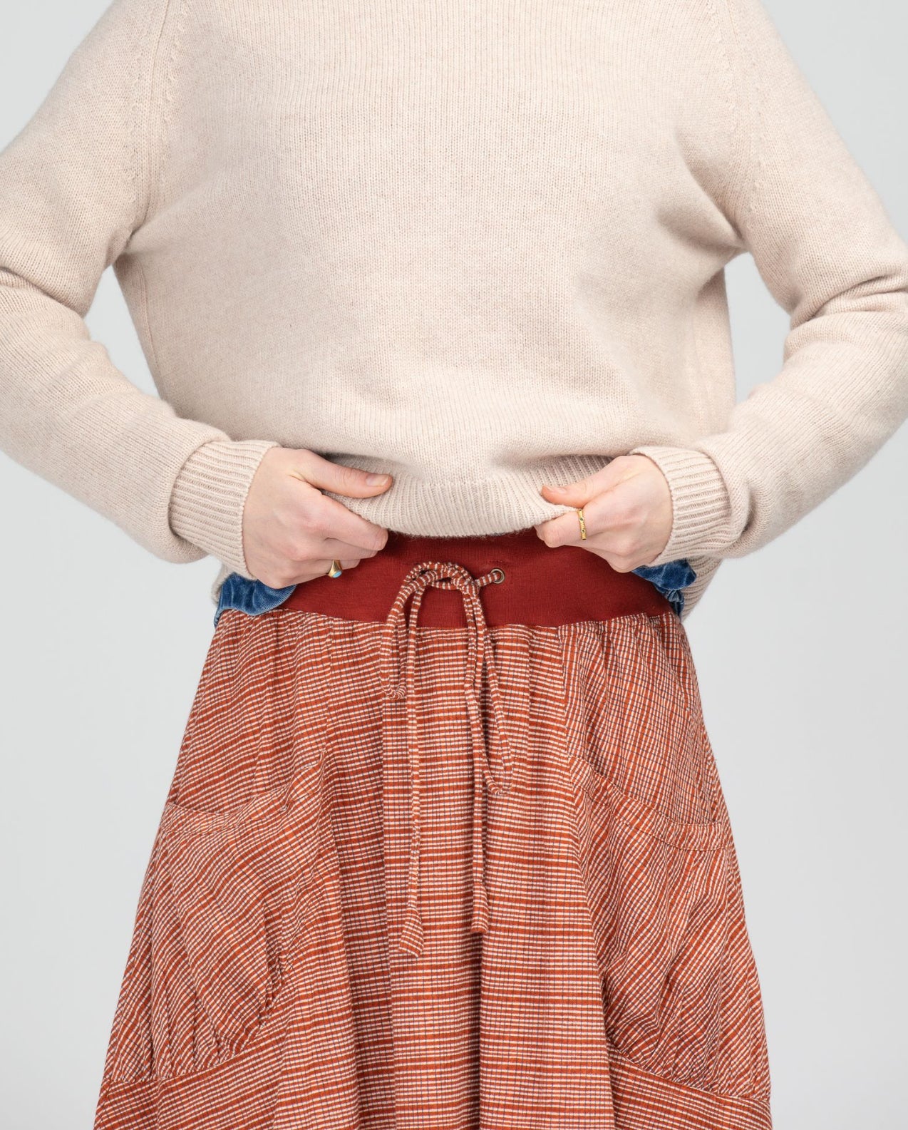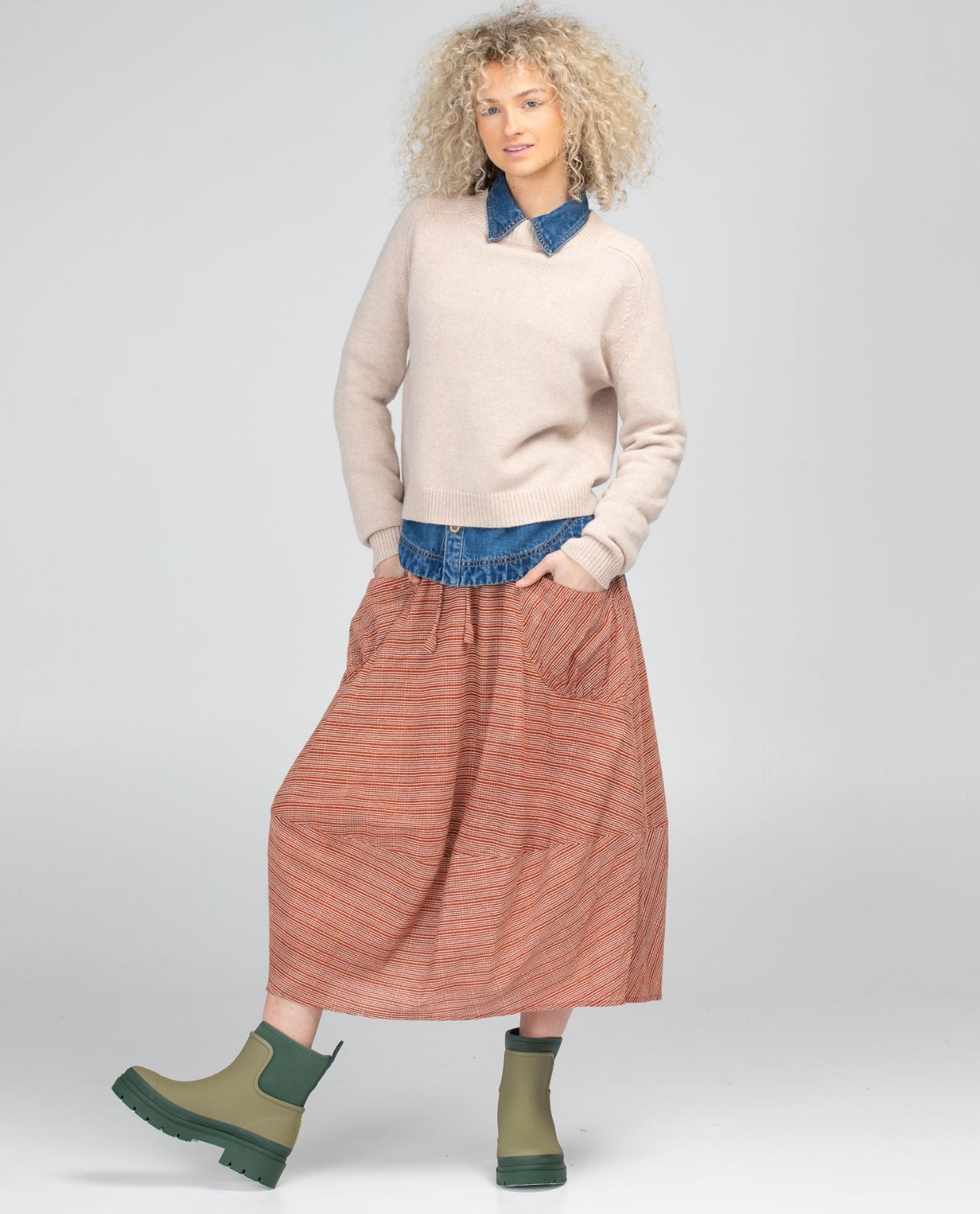The Boom Shankar Guru Skirt is a 100% cotton, 3/4 length cotton beauty with a super comfortable stretch cotton waistband, draw-string tie, and flattering shape. This skirt is fully lined and can be worn from season to season. With two front and two back pockets, the Guru Skirt is a versatile and easy-to-wear option for all shapes and sizes.