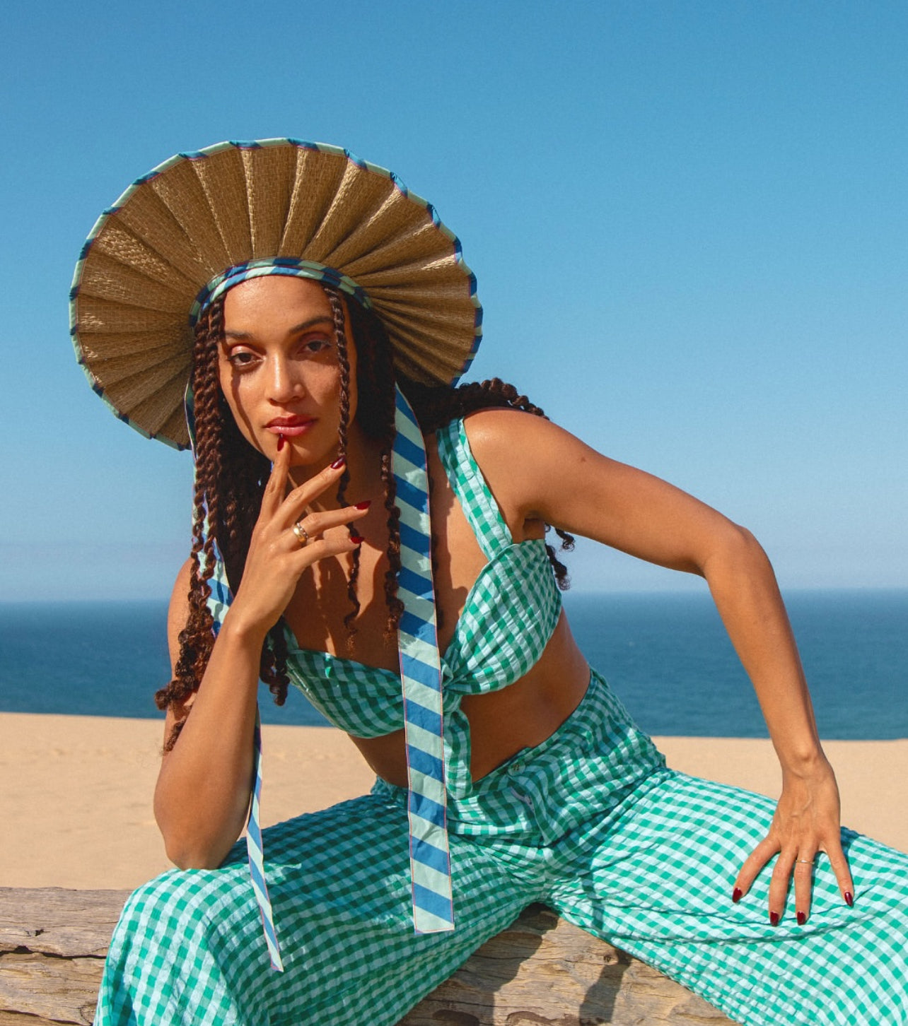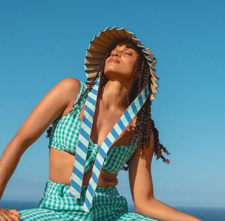 100% cotton seersucker gingham, crop top design, wide straps, bow tie opening front, shirring elastic back with flattering bust shaping to a low front neck.