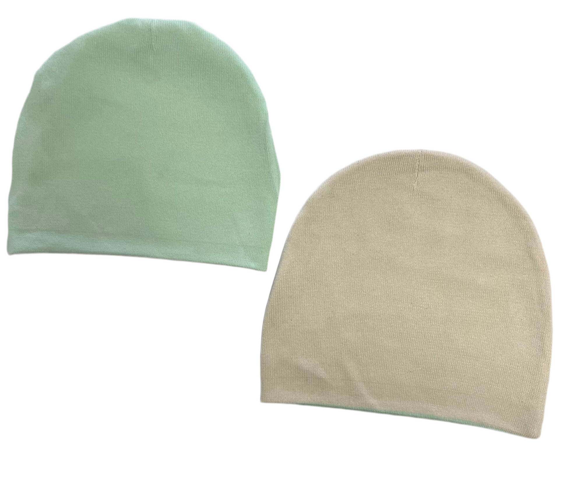 These lightweight single knit organic cotton beanies by ANONA are the perfect weight for in between seasons . The best part is they are reversible , so you not only get 2 beanies in one but you also get double warmth .If you are allergic to wool then these unisex beanies are for you !