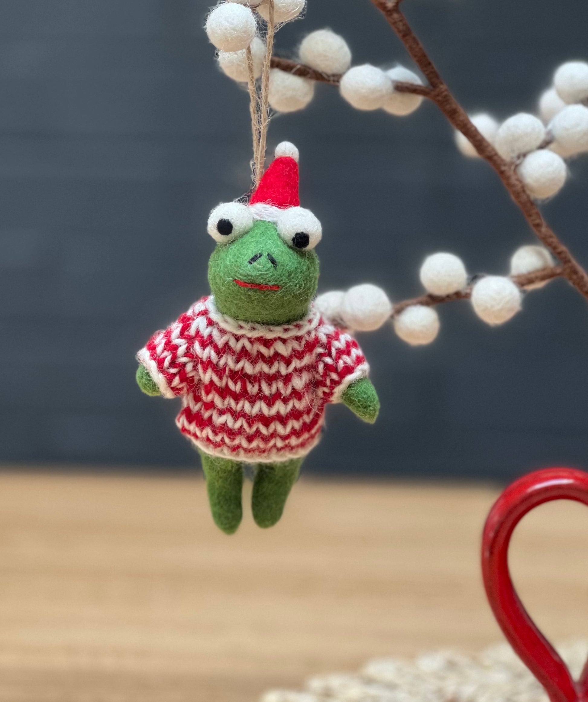 Say hello to our adorable green frog decoration. Wearing a cute red and white striped knitted jumper, this is our new favourite Xmas decoration for 2025!