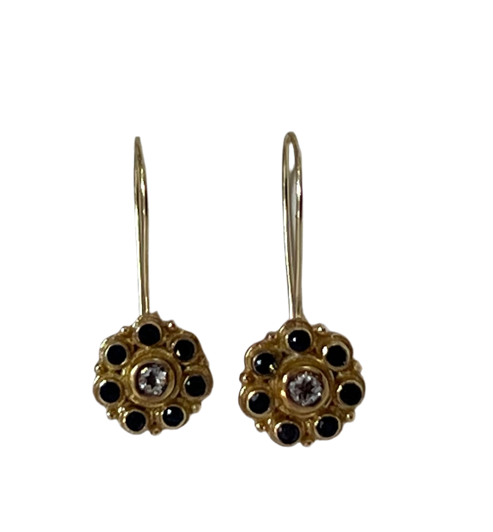 Our pretty flower design earrings are a simple yet timeless design. The white topaz stone in the middle is surrounded by the precious sapphire stones. Choose from stud or drop and either black sapphire with white topaz or pink sapphire with white topaz.