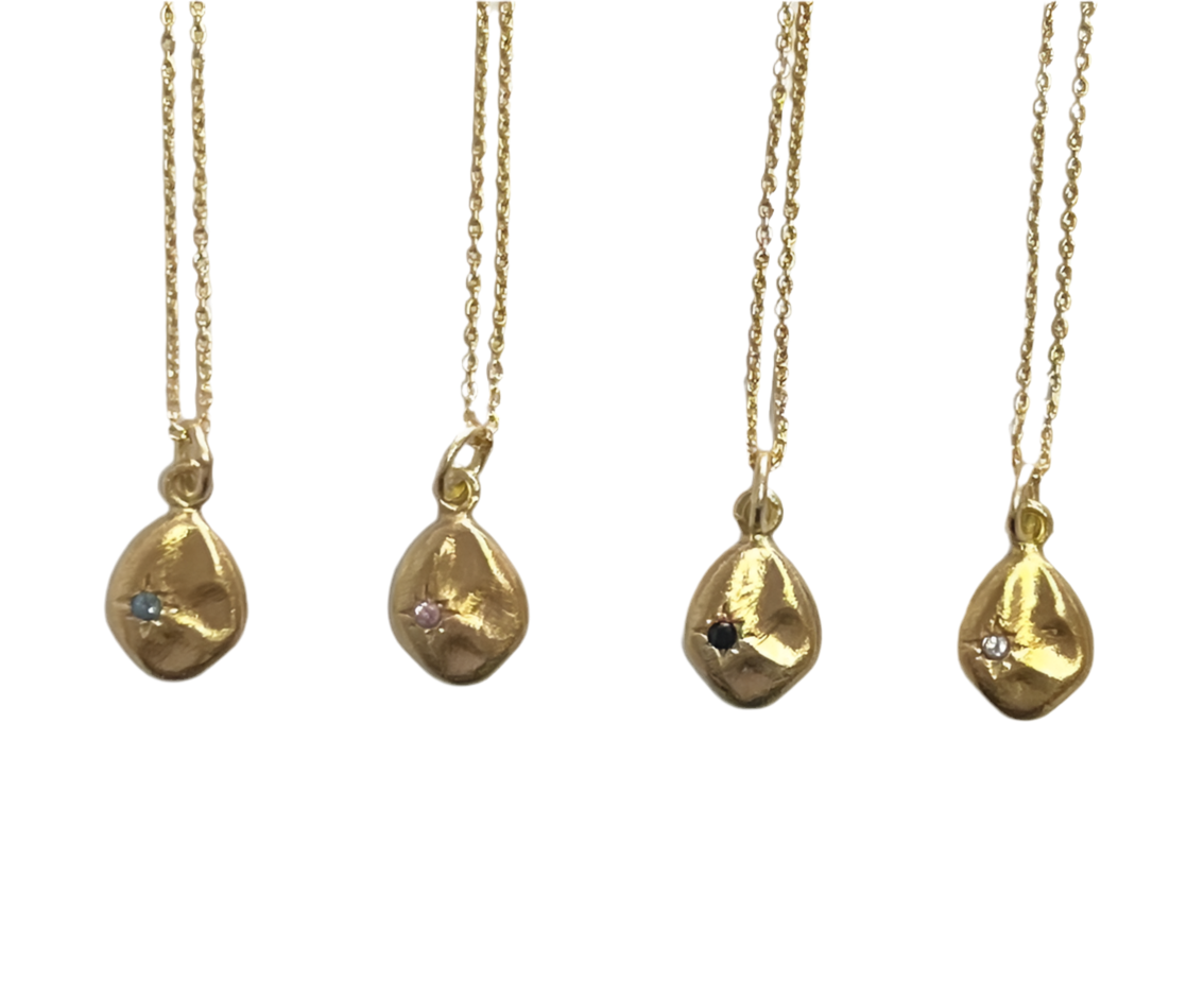 Explore the wabi sabi nature of metals and shapes with our SIGNET range of necklaces, featuring organic designs. We have enhanced the look with a small, off-centre stone, available in black sapphire, blue sapphire, pink sapphire, or white topaz..Match with our signet earrings for a complete set!