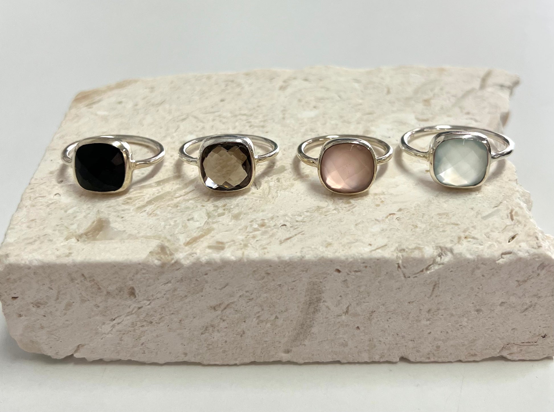 Email or visit us in store for stones available . We have a selection of semi precious stones, cut and set in a chunky square setting.