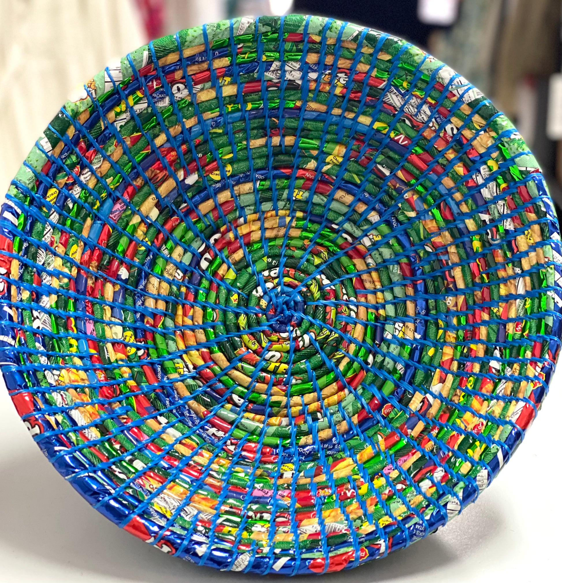 We love these bowls for so many reasons!! They are handmade in Nepal using discarded rubbish , predominantly chip and noodle packets. The rubbish is washed, dried and then cut into strips before it is wound around strips of grass, which has dried and gone hard. It’s then skillfully coiled, and stitched with string into shape and the end product is these amazing bowls !!