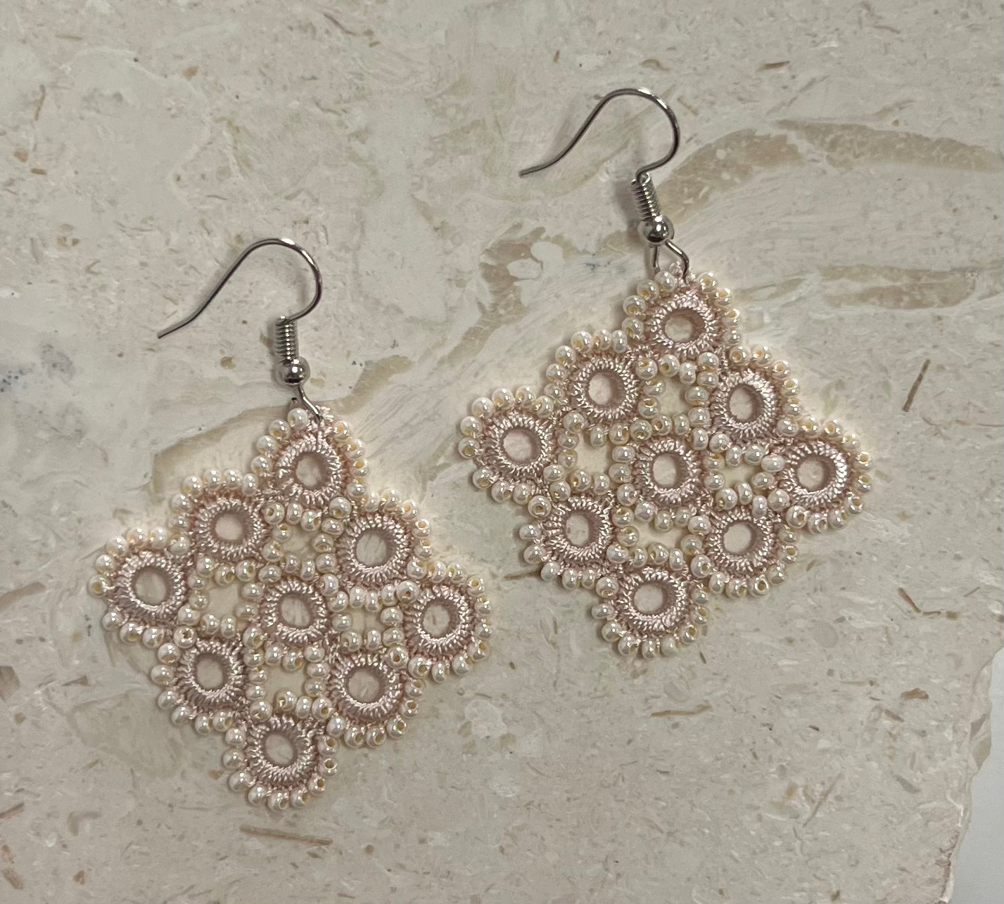 These simple diamond design earrings are hand-made using a traditional Turkish needle technique known as “hook needle”. This technique is a little bit like crochet and it’s passed on from generation to generation, is a symbol of delicacy, patience and beauty. They are light weight and delicate and perfect for any age any special occasion.