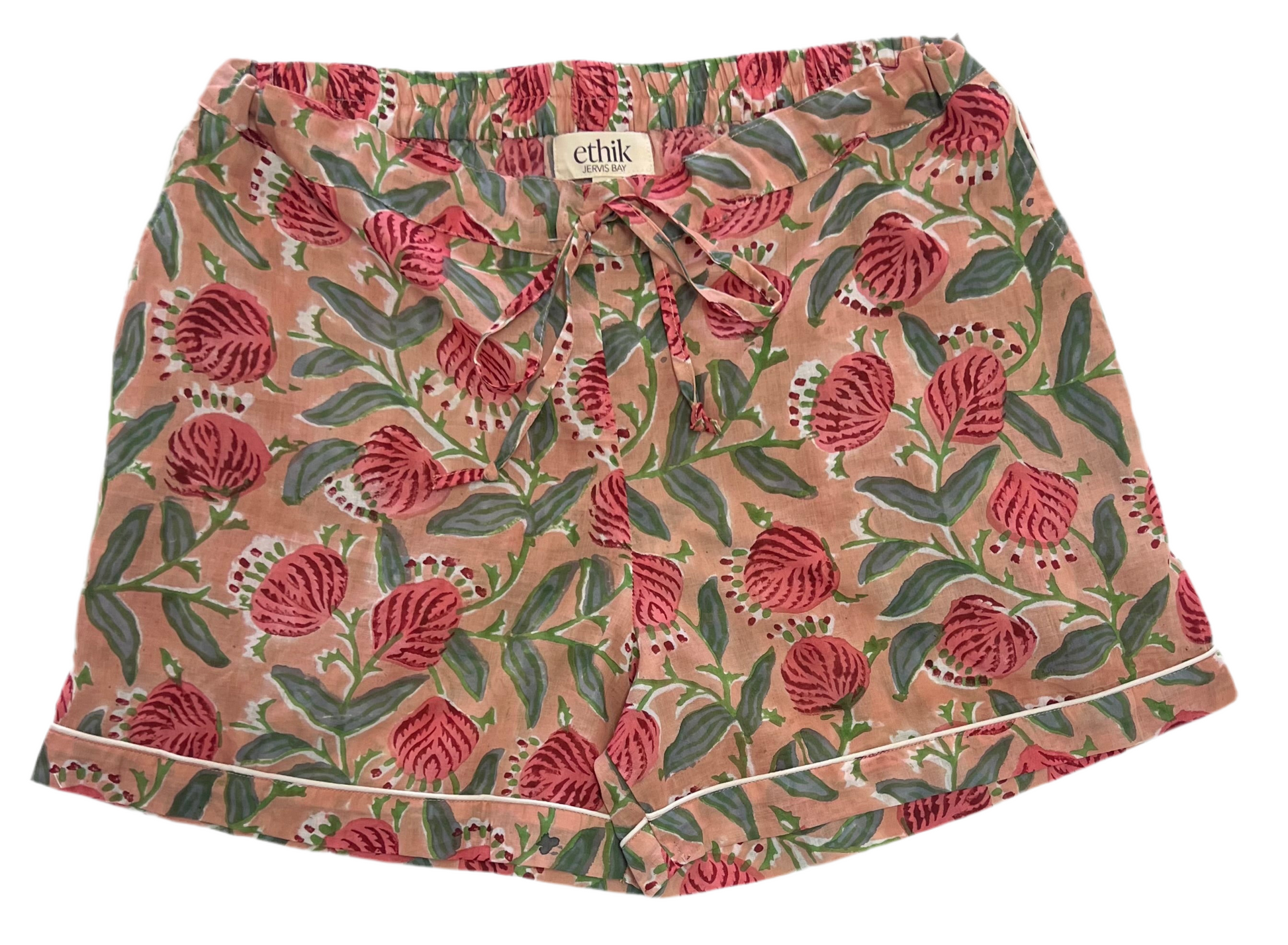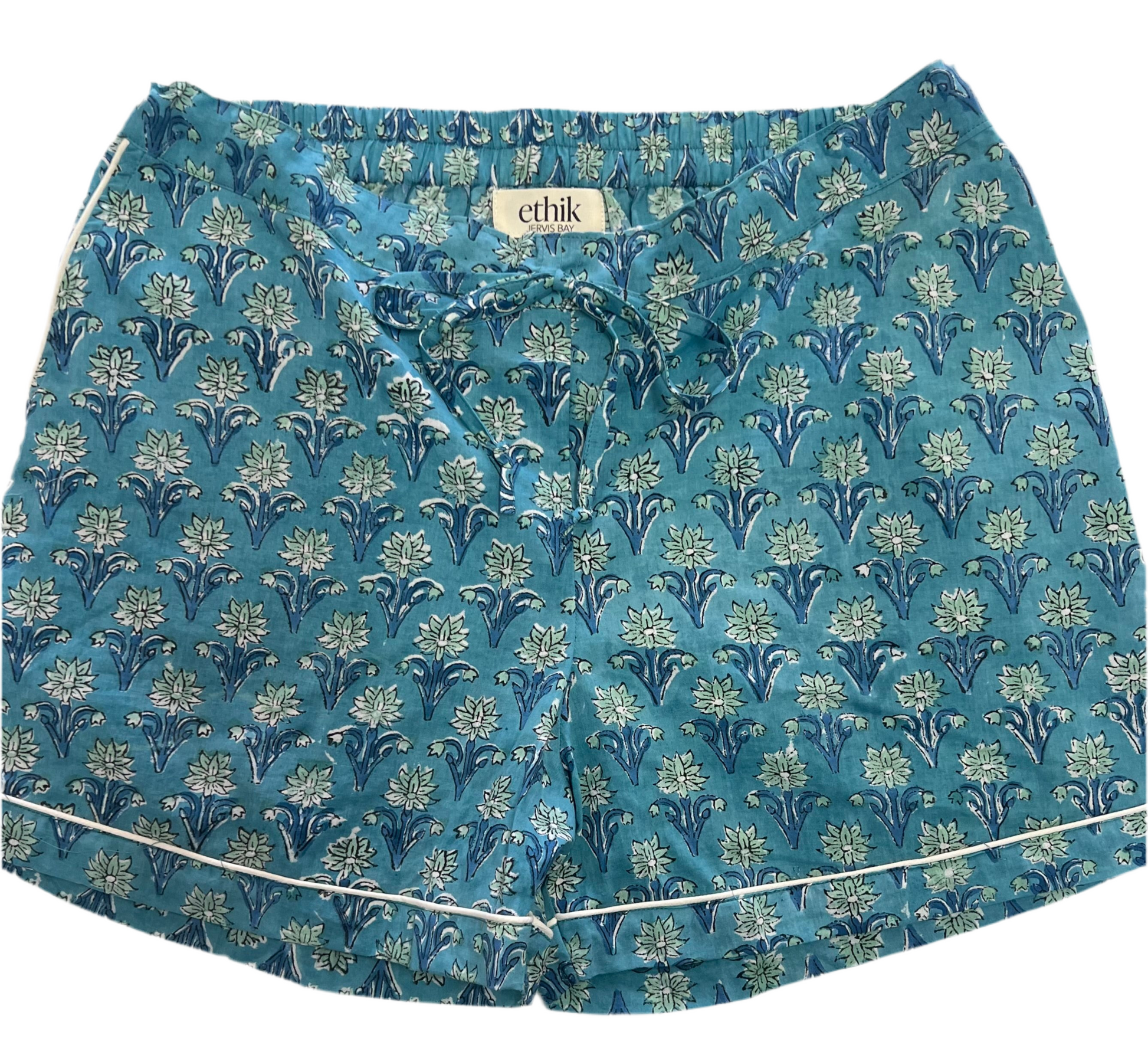 Cool and comfortable , our 100% cotton boxer shorts come in a range of beautiful hand block printed designs . The pockets and hem have piping trim , the back of the wasteband a comfortable elastic , and the front of the wasteband a drawstring to adjust if need be. The hardest decision will be which print to choose !