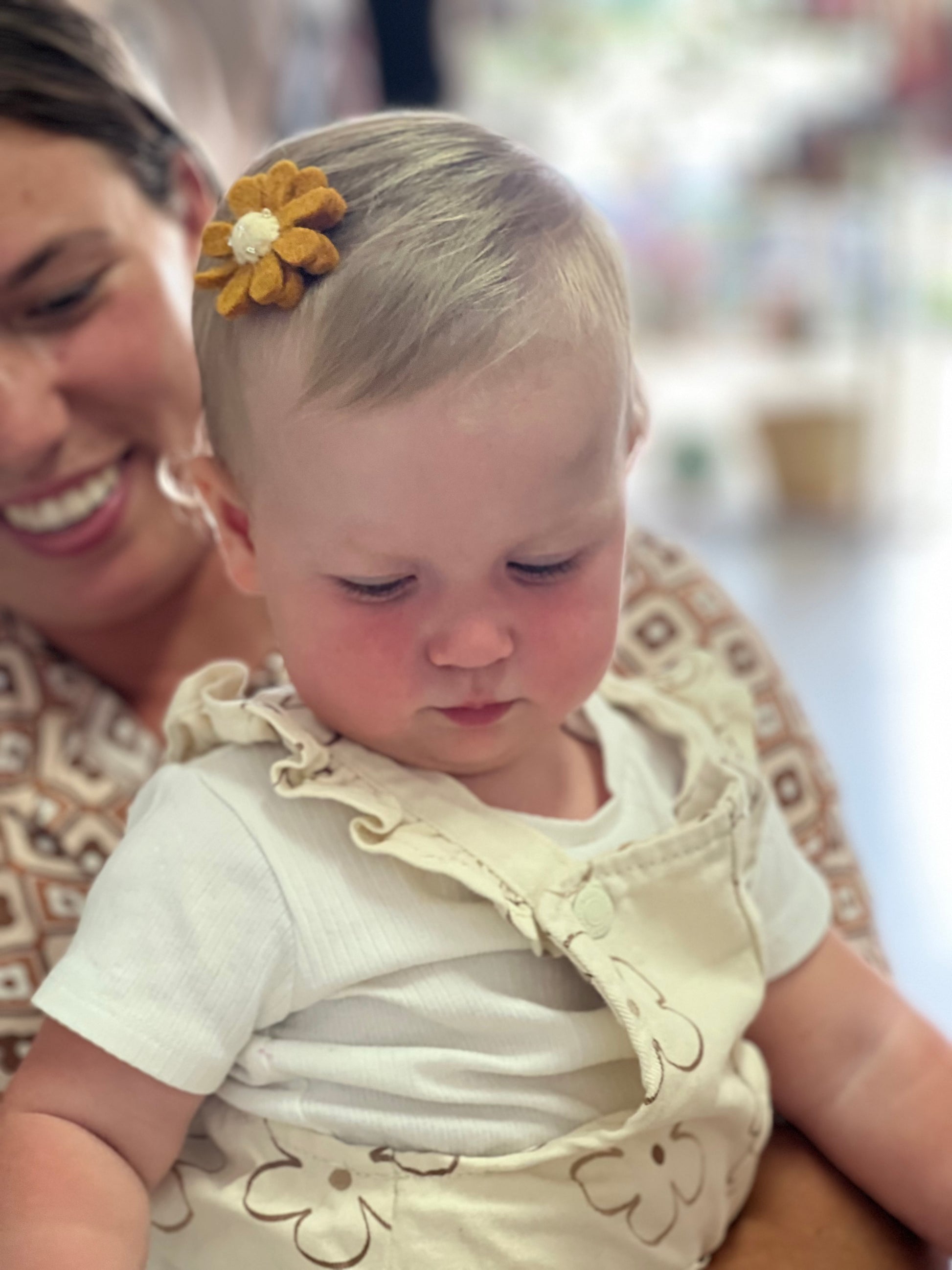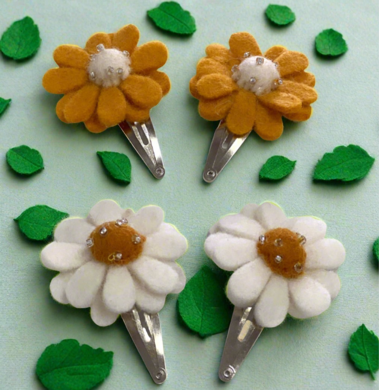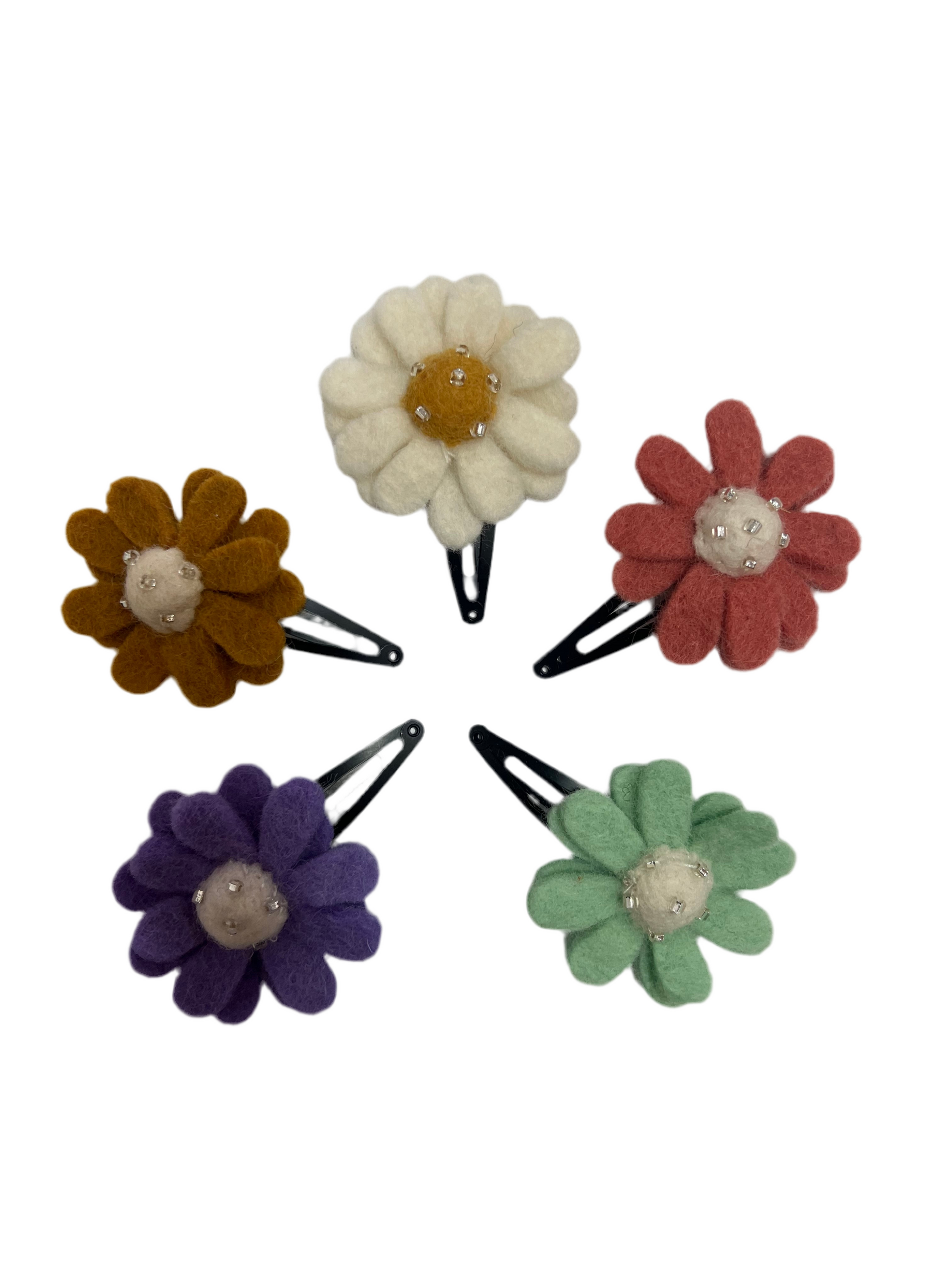 Brighten up your little one's day with our cute flower clips. These unique accessories are handcrafted with love by our talented felting team in Nepal. Get ready to add a touch of sunshine to any outfit!