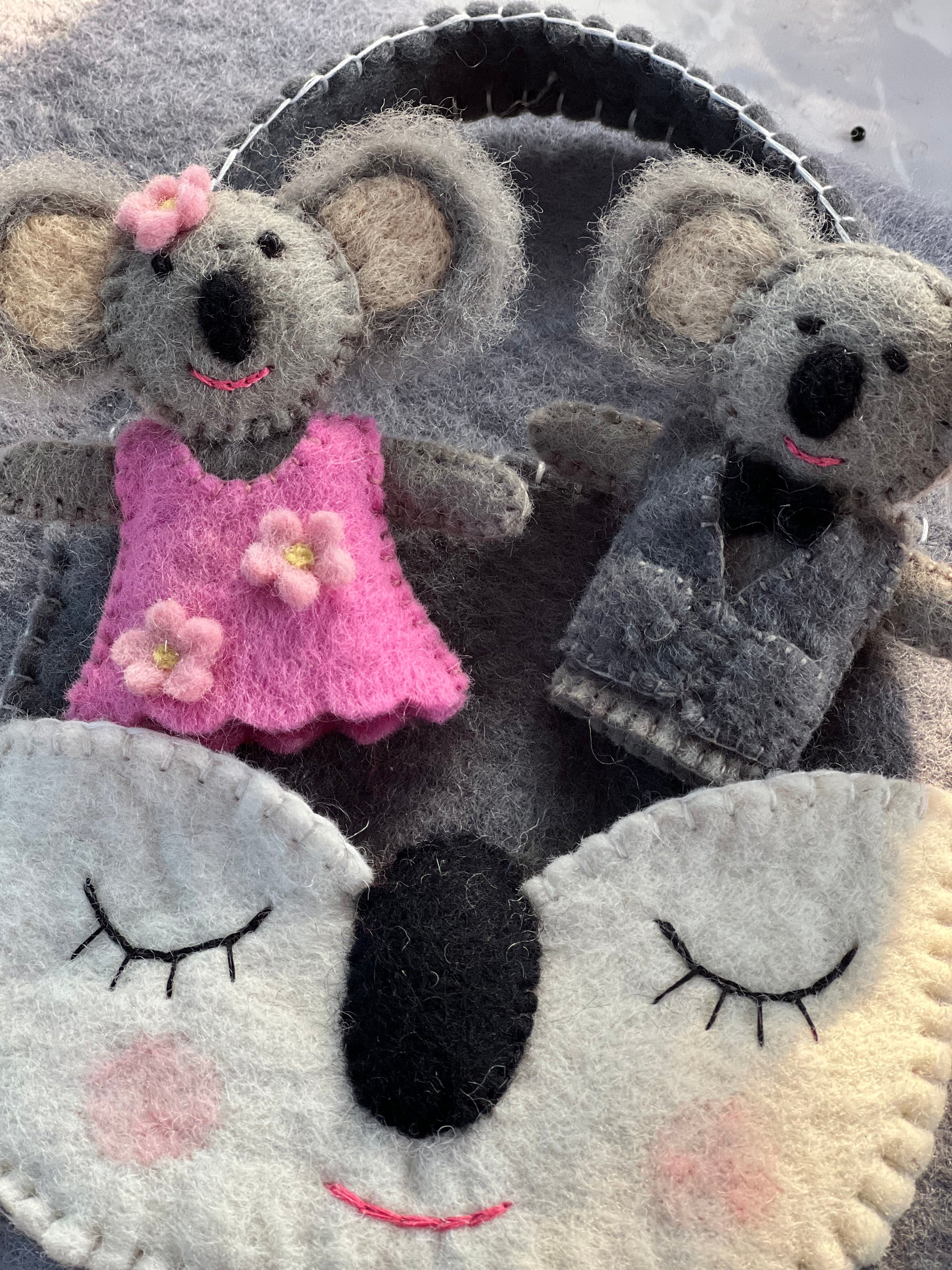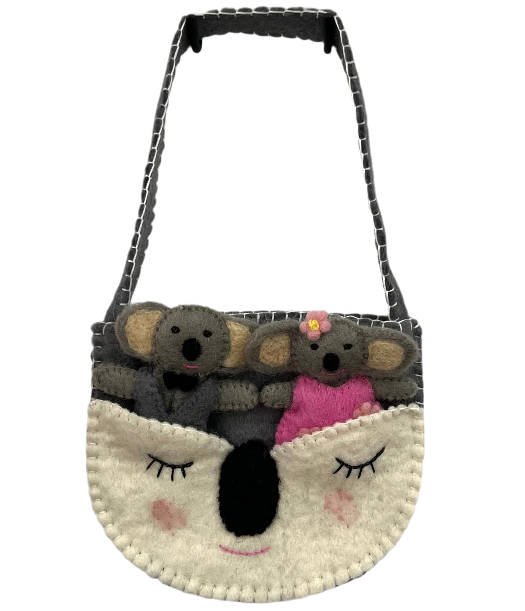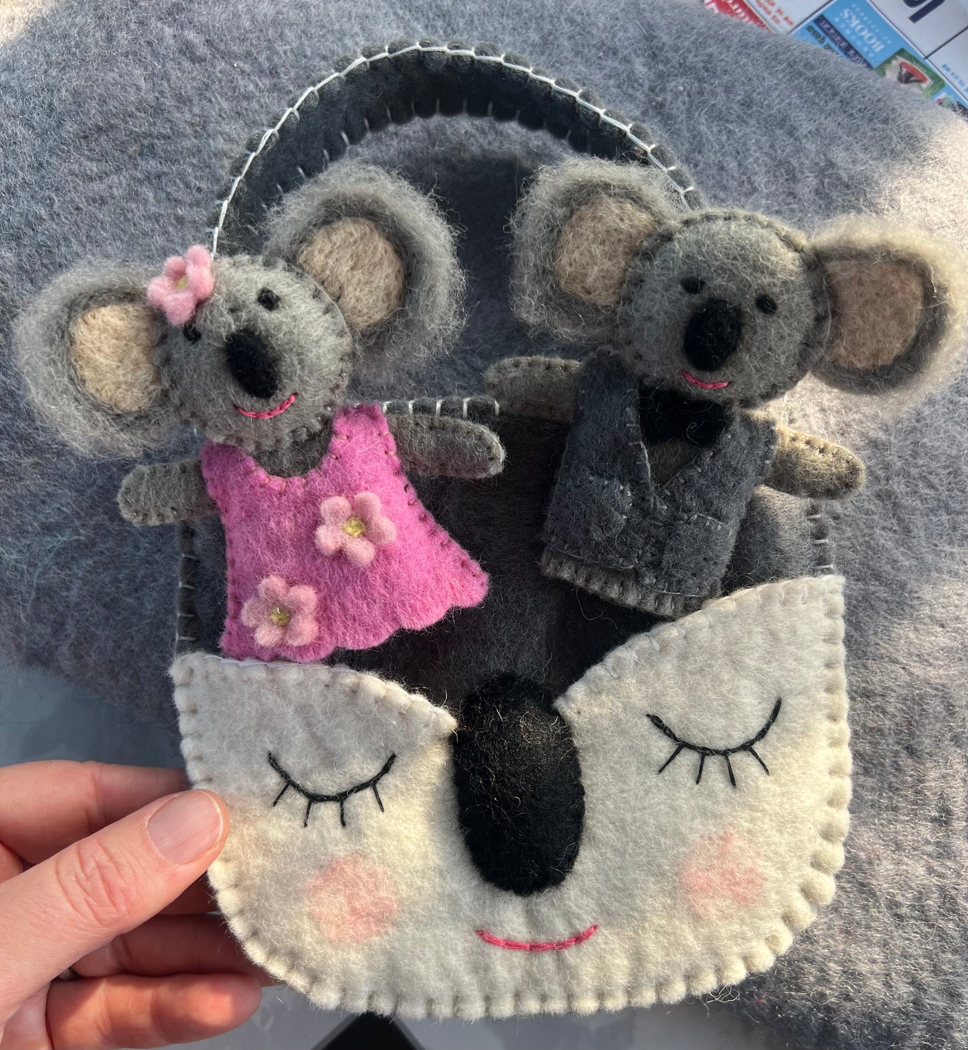 Introducing our new koala puppet bag, designed in collaboration with our talented felt producers in Nepal. Your little one will be smitten with this adorable little bag and very cute koala boy and girl set! Each puppet and bag is hand-felted with love, and finished with cute blanket stitching. The bag features two front pockets to keep the puppets safe or tuck them inside the bag for a nap. We made sure the bag is easy for little hands to access by leaving the opening free of zippers or buttons. And we know just how much kids love to stuff their bags with treasures, so this bag is perfect for