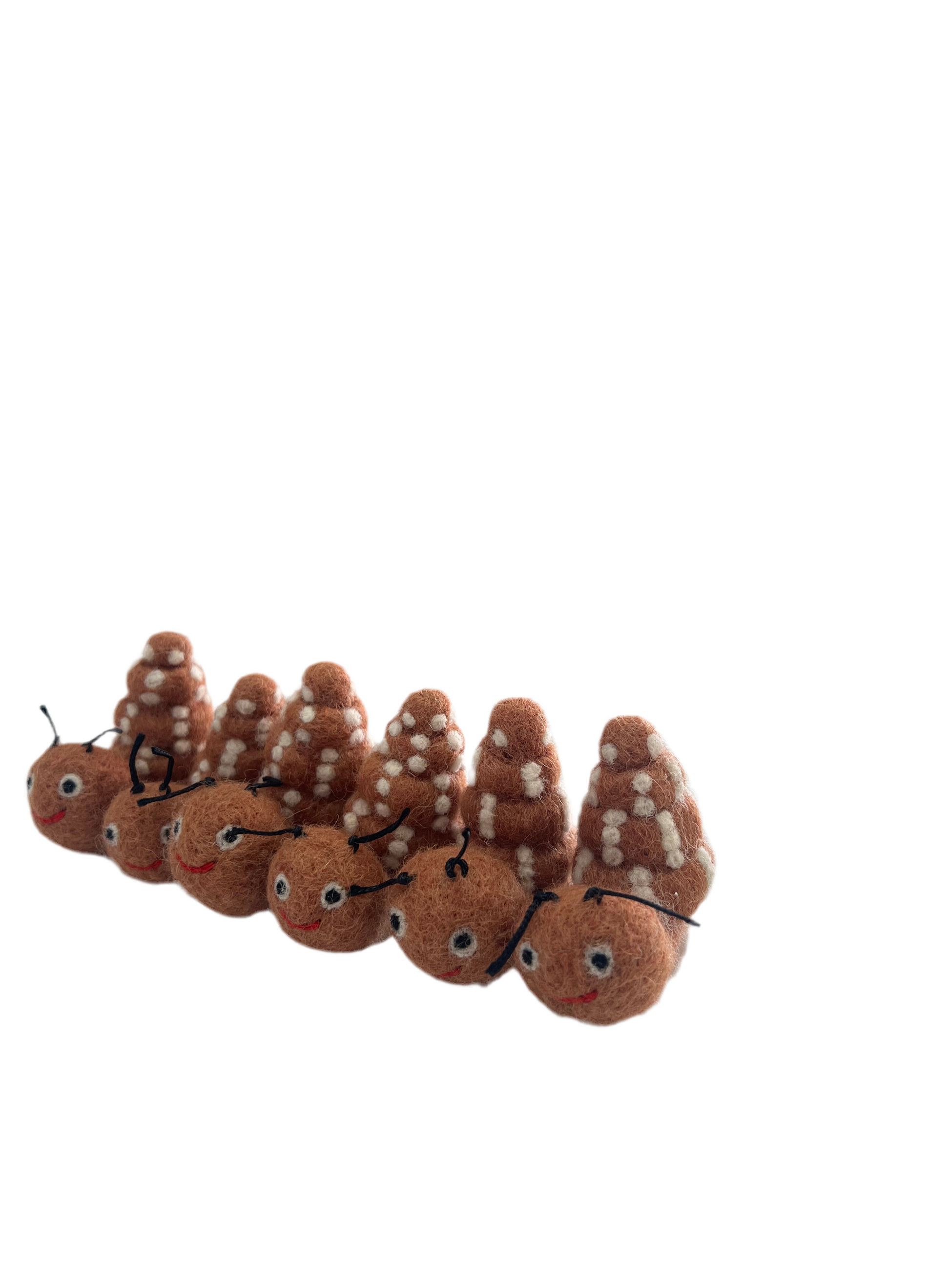 || the small snail measures approx 6cm high and the large snail 9cm high and they are solod wool with needle felted markings