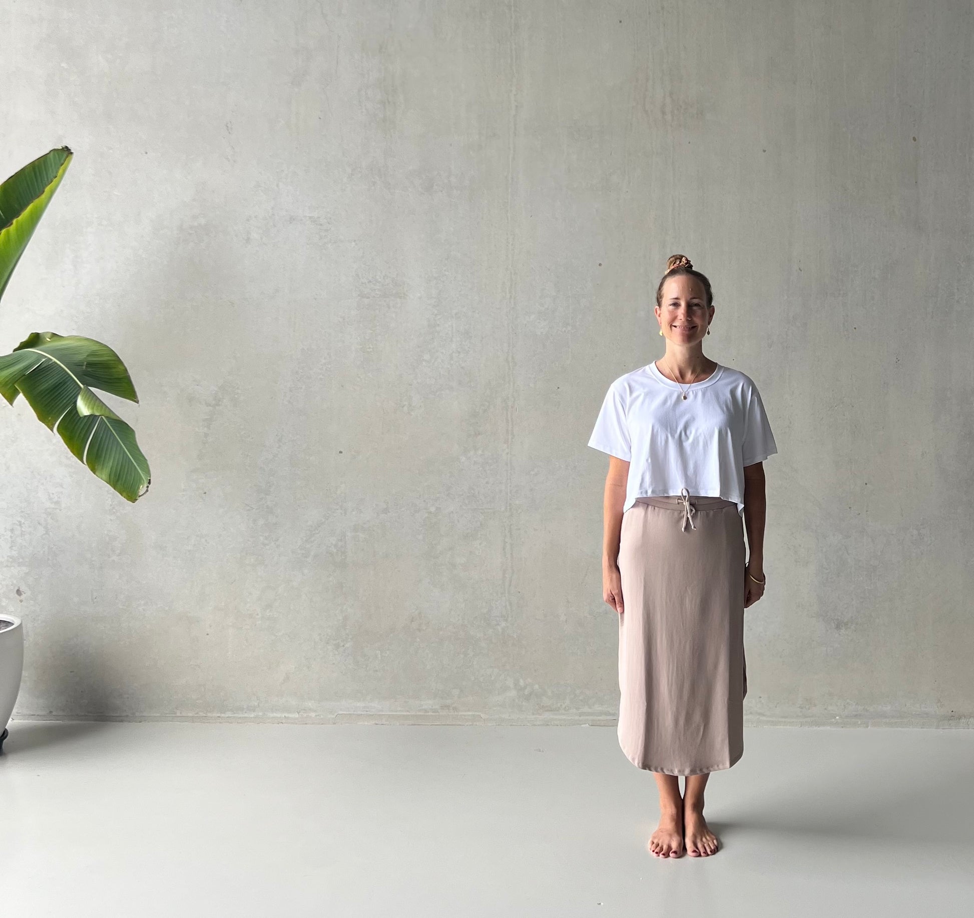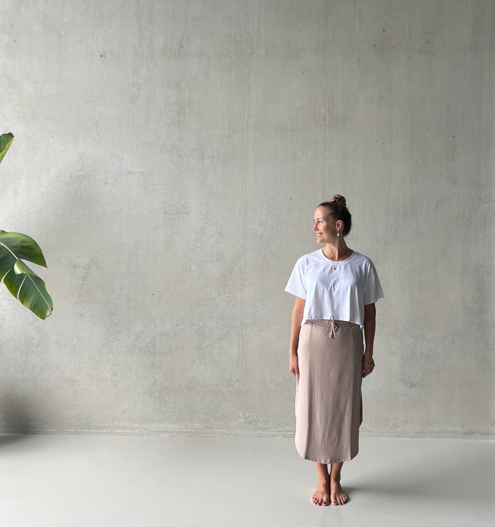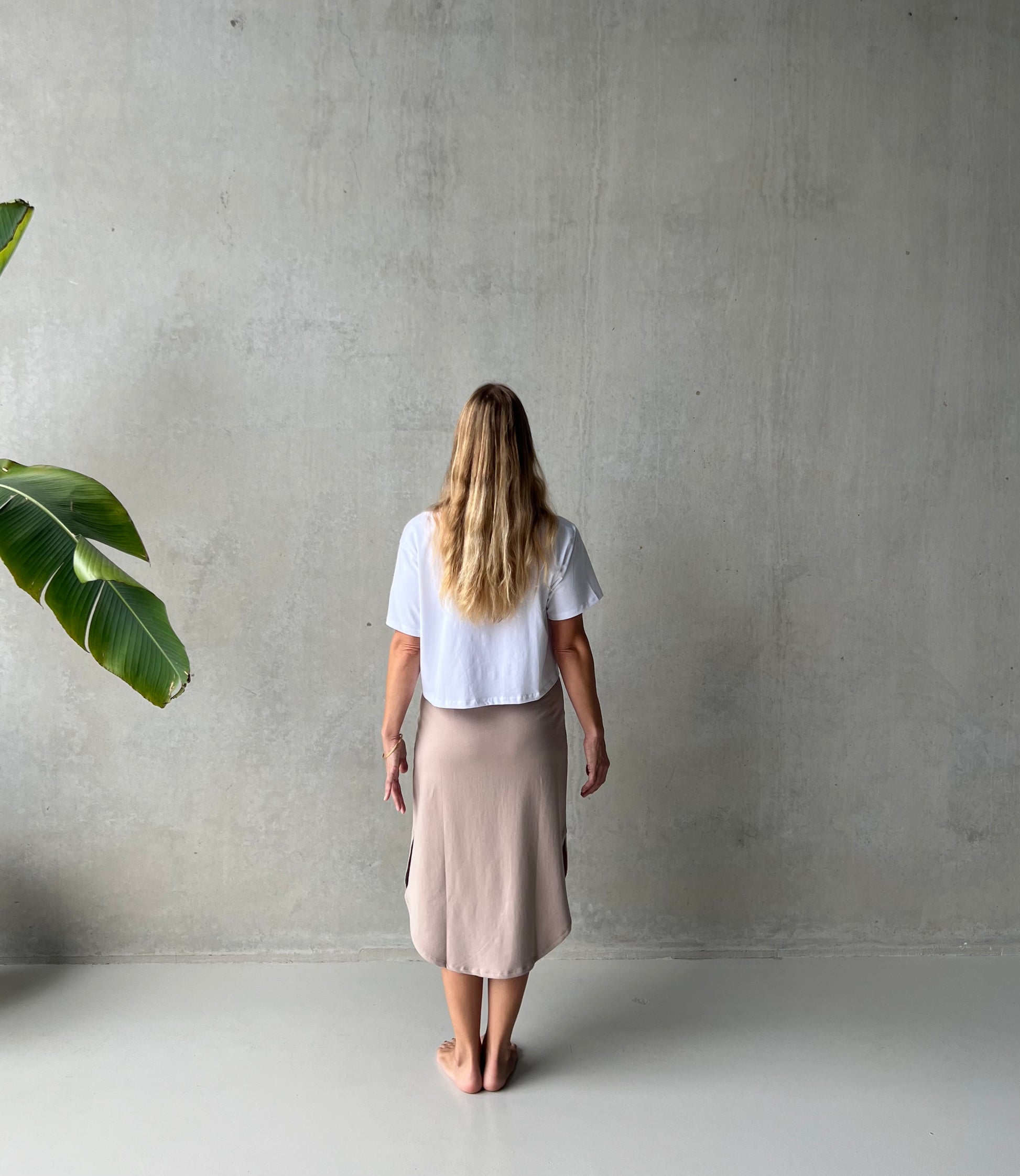 Say hello to everyone's favourite BARCELONA skirt. A timeless and versatile addition to any wardrobe we have made it with a medium weight fabric which is perfect for all seasons in Australia. Pair it with sandals or boots for a stylish look year-round. Featuring side pockets and a comfortable elastic and drawstring waistband, this midi-length skirt with a scooped hemline is both flattering and easy to dress up or down.
