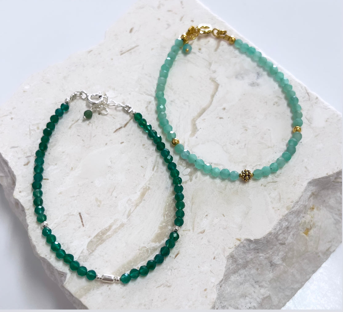 These delicate bracelets are the perfect gift for every girl, no matter what the age! They are handmade in Jaipur from rough cut quartz and come in a variety of stones. The adjustable chain clasp means they fit most wrist sizes. Choose from either silver chain or gold plated silver chain. Email for colours available.