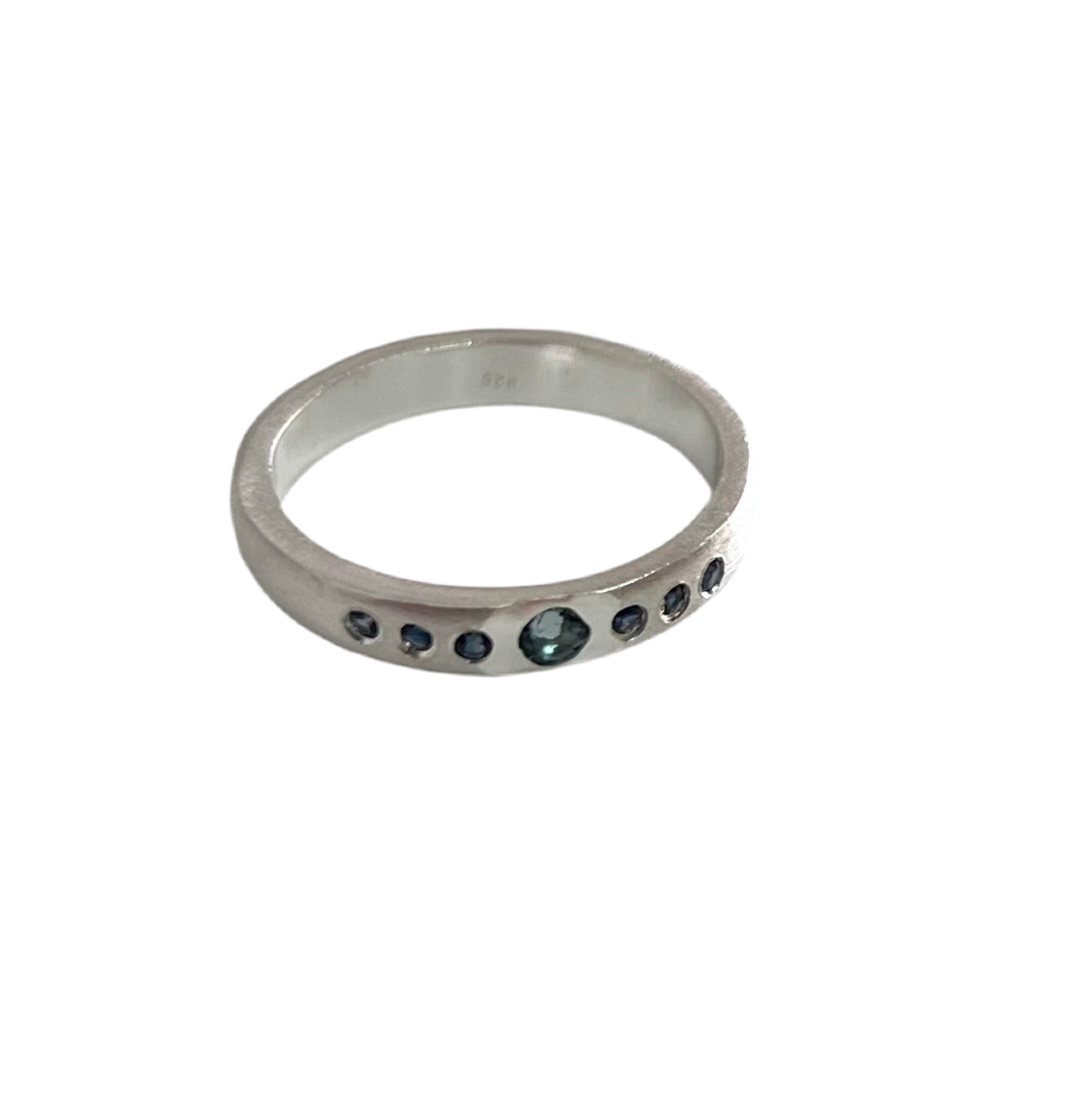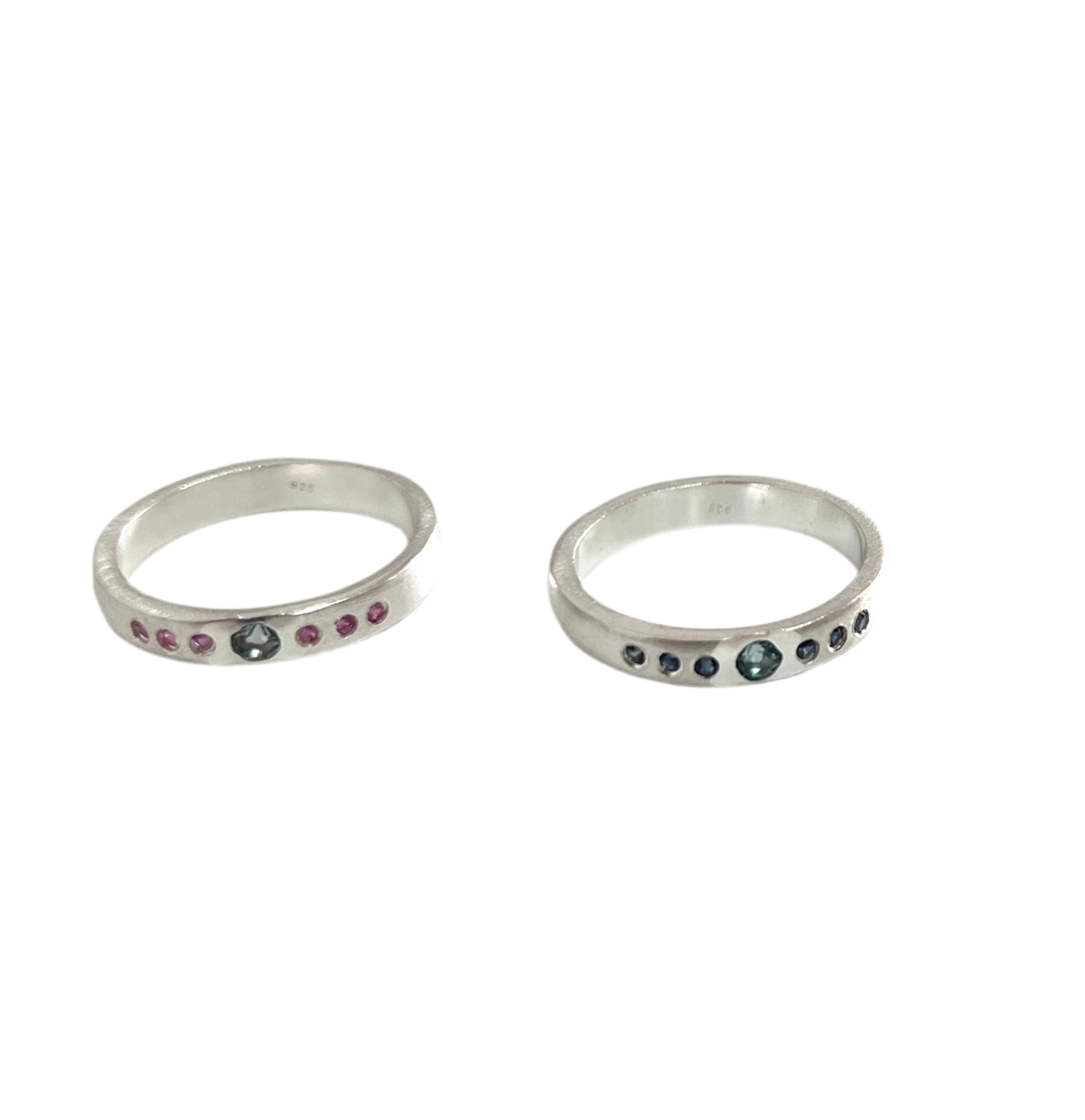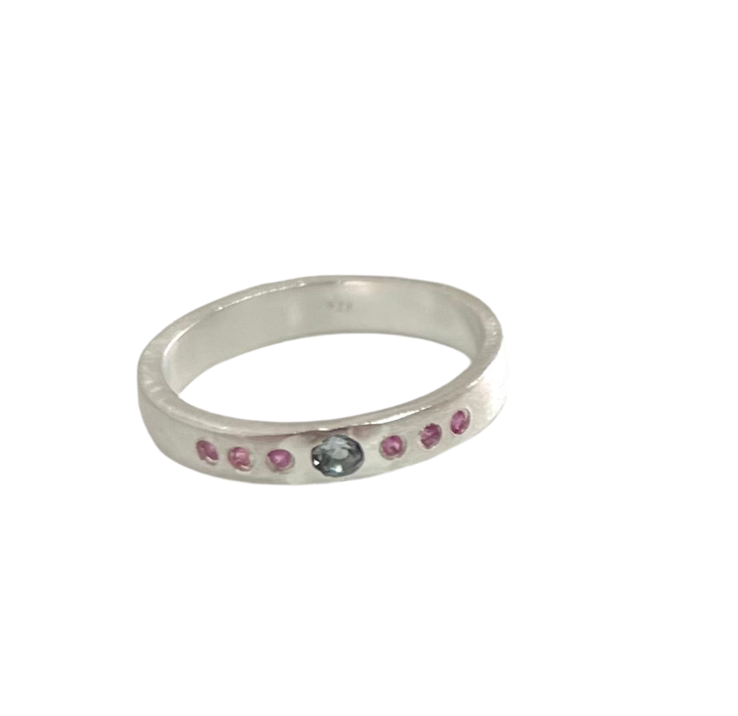 We've spiced up a basic band with some Bling !! The star of the show is a striking blue topaz nestled in the center, flanked by 3 dainty sapphires on each side. Take your pick of pink or blue sapphires 🩷💙