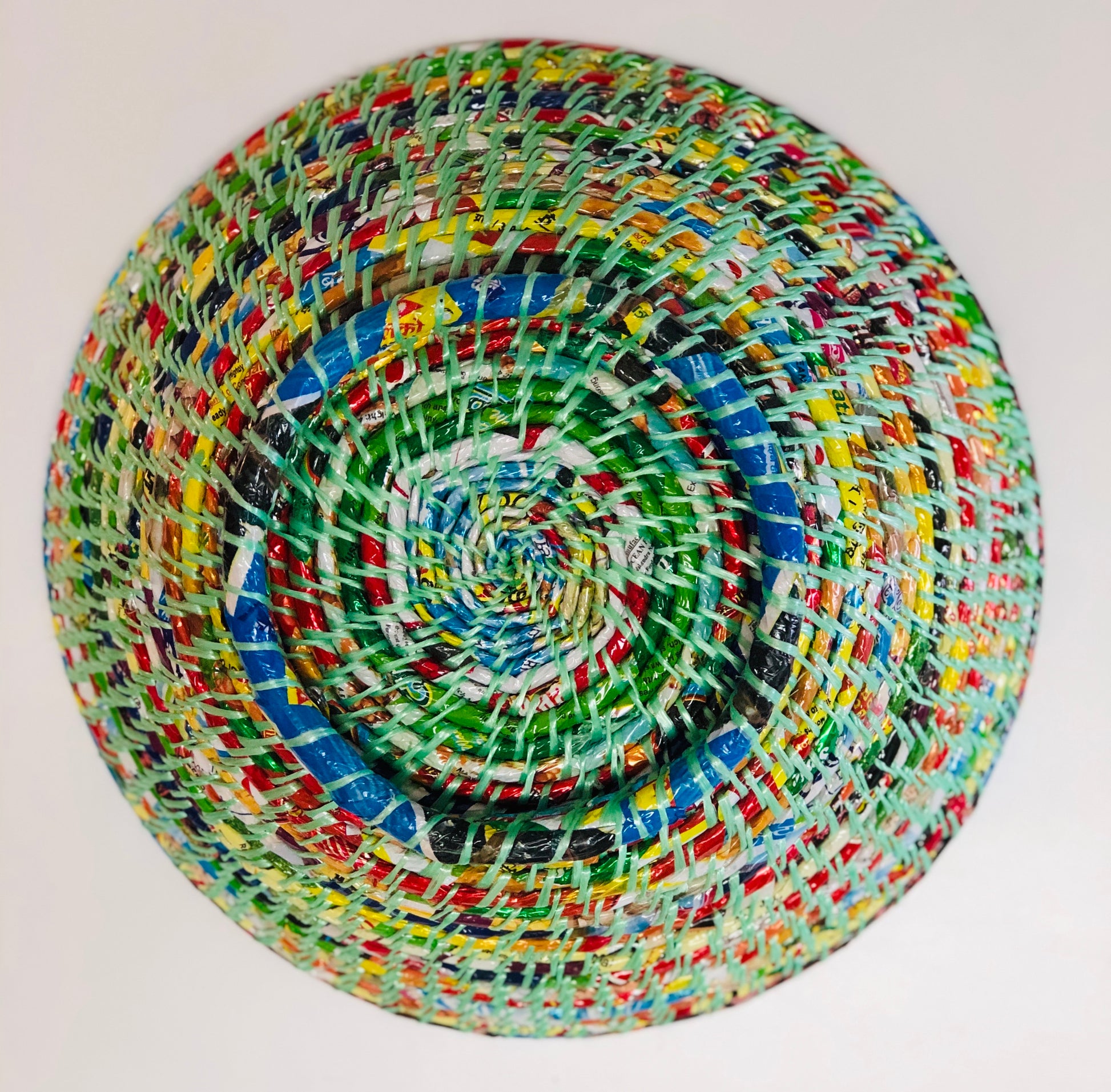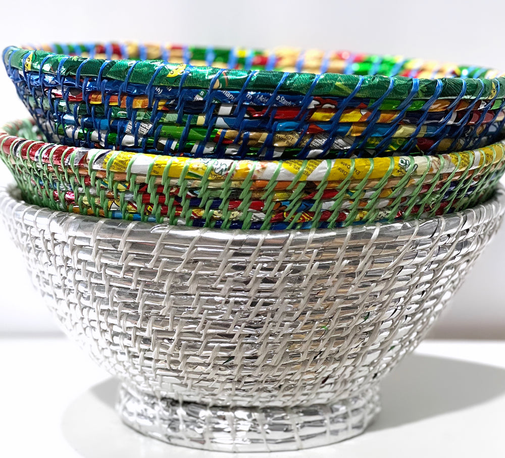 We love these bowls for so many reasons!! They are handmade in Nepal using discarded rubbish , predominantly chip and noodle packets. The rubbish is washed, dried and then cut into strips before it is wound around strips of grass, which has dried and gone hard. It’s then skillfully coiled, and stitched with string into shape and the end product is these amazing bowls !!