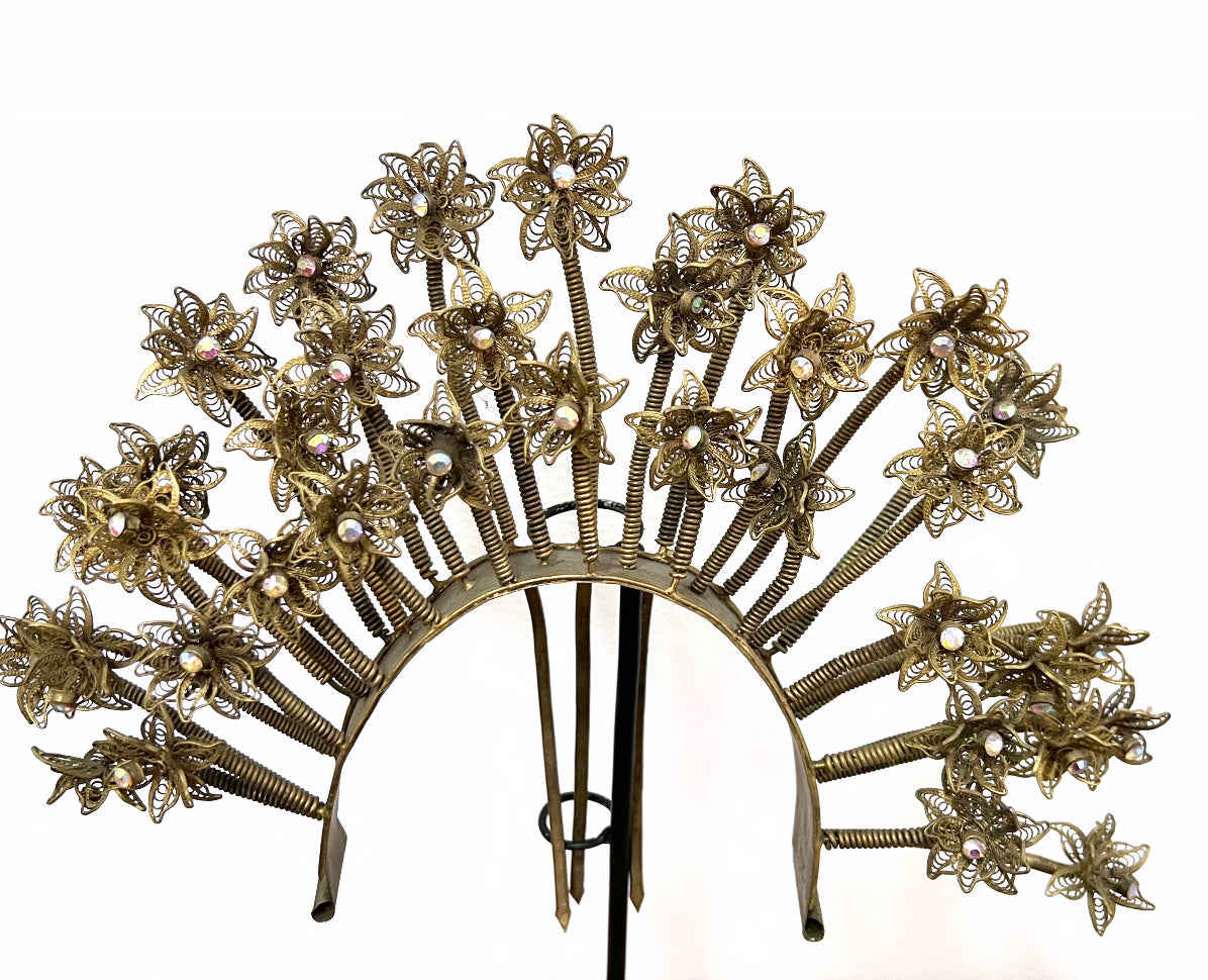 This exquisite vintage bridal headpiece, is a stunning genuine one off piece that is a decorators dream. Standing approx 45cm on its stand, and approx 35cm wide, the detail on this striking traditional Sumatran wedding piece is incredible. View in store to get a real sense of the size and detail. Purchase and collection in store only as too fragile and heavy to post.